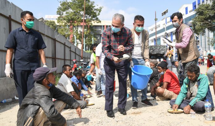 असाेज १४, काठमाडौं । कोरोना महामारीका कारण रोजगारी र काम गुमाएकाहरुलाई काठमाडौंको खुलामञ्चमा गाेरखा देखि पुगेका डा.बाबुराम भट्टराइले खाना वितरण गरेका छन् । यतिबेला राेजगारी गुमाएका नागरिकहरुका लागि विभिन्न सामाजिक संघसंस्थाले खाना खुवाइरहेका छन् । बुधबार खाना बाँड्ने मान्छे भने गाेरखाका बाबुराम भट्टराइ थिए । पूर्वप्रधानमन्त्री डा. बाबुराम भट्टराई आज खुलामञ्चमा खाना बाँड्न पुगेका हुन