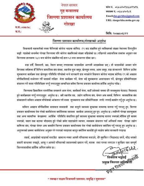 ‘गोरखा सदरमुकाम तथा व्यापारिक केन्द्रहरुमा आर्थिक गतिबिधि सञ्चालन हुदा स्वास्थ्य सुरक्षाको मापदण्ड पालना नभएको, भौतिक दुरी कायम नभएको, पसलहरुमा भीडभाड हुने गरेको पाइएको छ, सूचनामा भनिएको छ, गोरखा उद्योग बाणिज्य संघ, चेम्बर अर्फ कर्मसले जिल्ला प्रसासन कार्यालयमा पेश गरेको कार्ययोजना बमोजिम व्यवसाय सञ्चालन गर्न अनुरोध छ ।’ अनुगमनको क्रममा कार्ययोजना अनुसार नगरेको पाइए कानुन बमोजिम कारवाही हुने जिल्ला प्रसासन कार्यालयले जनाएको छ । प्रसासनले सार्वजनि यातायातका साधानमा समेत सुरक्षा मापदण्डको पालन नभएको भन्दै सकेसम्म धेरै धुमफिर नगर्न, परिवारमा भित्रमात्र सामान्य रुपमा दशै मनाउन, मास्क तथा पञ्जा लगाउन र सुरिक्षत हुन जिल्लाबासीलाई अपिल गरिएको छ ।