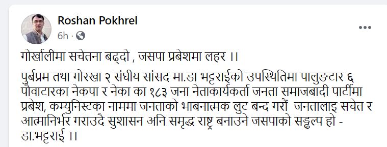बुधबार गाेरखा आएका पूर्व प्रधानमन्त्री डा बाबुराम भट्टराइ तामझामका साथ गाउँ परिक्रममा गर्दै बृहत आमसभा गर्दै पार्टी प्रवेश कार्यक्रम गर्दै गर्दै हिडेका छन् । प्रकाेपका समय भीड गरेर कार्यक्रम गर्दै हिडेका भट्टराइका स्वकिय सचिवले लेखेका आजकाे स्टाटस र तस्वीर ।