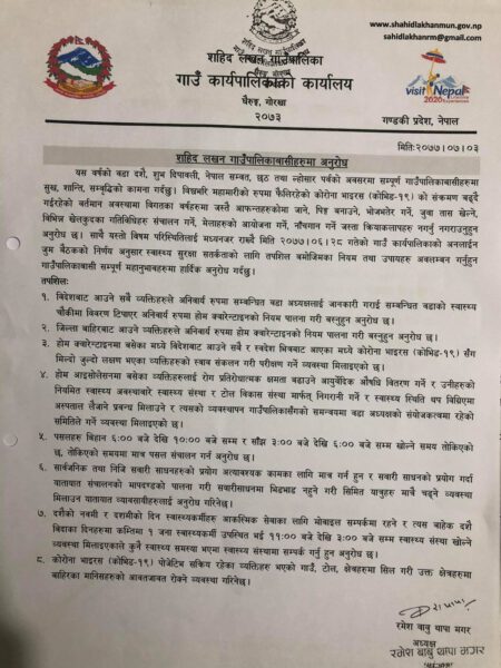 कार्तिक ४, शहिदलखन ।  शहिद लखन गाउँपालिका गाेरखाले दशैँ तिहार लगायका चाडपर्वलाइ लक्षित गर्दै कुनै पनि जात्रा तथा उत्सवहरु नगर्न निर्देशन दिएको छ। पालिका अध्यक्ष रमेश थापाद्वारा हस्ताक्षरित निदेशनात्मक सूचनामा उक्त कुरा उल्लेख छ । काेराेना भाइरस (कोभिड -१९ ) को संक्रमण जोखिमलाई मध्यनजर गर्दै स्वास्थ्य सुरक्षा सतर्कताको ख्याल गर्न सबैका लागि सूचना जारी गरिएको हाे । निर्देशनलाइ अक्षरस पालना गर्न पालिकाले नागरिकहरुलाइ आग्रह गरेकाे छ ।