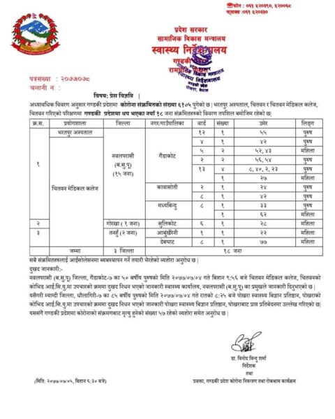 समाचारस्वास्थ्य गण्डकी प्रदेशमा काेराेना सङ्क्रमितकाे सँख्या छ हजार १०५ पुग्याे By मनासलु - बुधबार, कार्तिक ५, २०७७ प्रकाशित मिति : 0 156 कार्तिक ५,पाेखरा । अध्यावधिक विवरण अनुसार गण्डकी प्रदेशमा कोरोना संक्रमितको संख्या ६१०५ पुगेको छ | भरतपुर अस्पताल, चितवन र चितवन मेडिकल कलेज, चितवन गरिएको परिक्षणमा गण्डकी प्रदेशमा थप भएका नयाँ १८ जना संक्रमितहरुको विवरण तपशिल बमोजिम रहेको छ ।