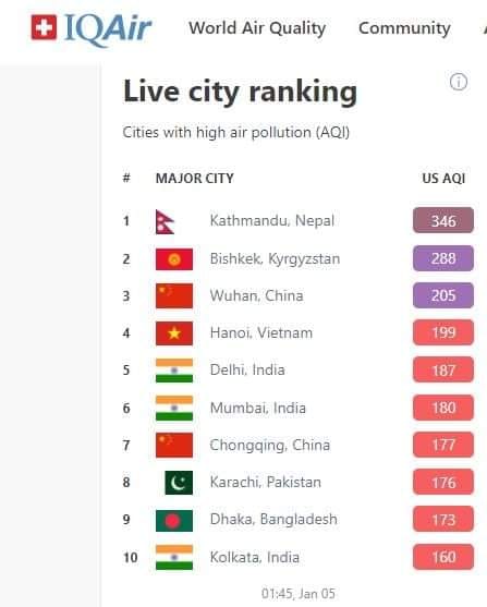दोस्रो नम्बरमा किर्गिस्तानको बिस्केक, तेस्रो नम्बरमा पाकिस्तानको कराँची, चौथोमा चीनको वुहान रहेका छन् । प्रदूषणका कारण नागरिकको स्वास्थ्यमा समेत असर परेको छ । मौसम धुम्मिएका कारण पनि प्रदूषणको मात्रा बढ्न गएको वातावरणविद्हरुले बताएका छन् । उपत्यकाको वायु प्रदूषण खतराको तह माथी पुगेसंगै सरकारले आवश्यक नपरी बाहिरन ननिस्कन आग्रह गरेको छ ।