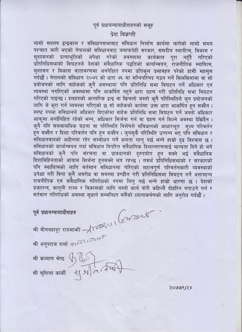 पूर्व प्रधानन्यायाधीशहरु मीनबहादुर रायमाझी, अनुपराज शर्मा, कल्याण श्रेष्ठ र सुशीला कार्कीले आज एक संयुक्त विज्ञप्ति जारी गरी प्रधानमन्त्रीको कदमलाई असंवैधानिक भनेका हुन् ।