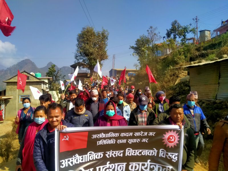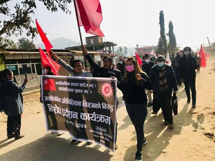गोरखा नगरपालिका अन्तरगत वडा नं १० छेपेटारमा र्याली तथा विरोध सभा भएको छ । नगर कमिटिका संयोजक विशेश्वर कट्टेलको अध्यक्षतामा भएको कार्यक्रममा केन्द्रिय सदस्य हरीराज अधिकारी, जिल्ला कमिटि सचिवालय सदस्य यादव बस्नेत, नगर सचिव कृष्ण राना, रामकृष्ण भट्ट लगायतले मन्तब्य गरेका थिए । केन्द्रीय सदस्य अधिकारीले सँसद पुनर्वहालीकाे विकल्प नरहेकाे बताए । सँघर्ष र बलिदानबाट प्राप्त उपलब्धीलाइ ओलीले चिथाेर्न लागेकाे उनले बताए ।