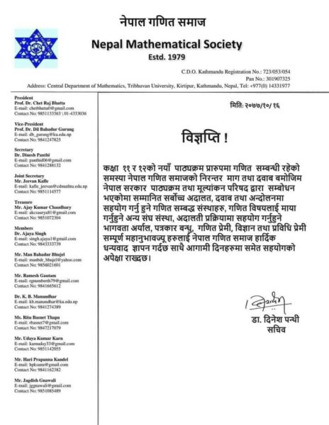गणितलाई अनिवार्य बनाउन लविङ गर्दै आएको नेपाल गणित समाजले सरकारको यो निर्णयको स्वागत गरेको छ । समाजका सचिव डा. दिनेश पन्थी भन्छन्, ‘यो निर्णयका लागि नेपाल सरकार र यो अभियानमा साथ दिनुहुने सबैलाई धन्यवाद ज्ञापन गर्न चाहन्छौं ।’