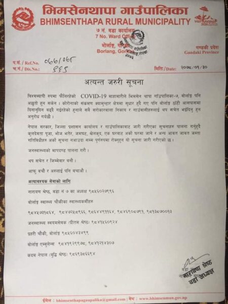 गाेरखा । जिल्लाकाे भीमसेनथापा गाउँपालिका वडा नम्वर ७ ले आज एक विज्ञप्ती जारी गरी गाउँघरमा हुने भाेजभतेर, कुल देवता पूजा, जमघट,खेलकुद, एक घरबाट अर्काे घरमा जाने क्रियाकलापहरु अर्काे सूचना जारी नहुँदा सम्म नगर्न र नगराउन अत्यन्त जरुरी सूचना जारी गरेकाे छ । पालिका र जिल्लाबाट भएकाे आदेश अक्षरस पालना गर्न वडाले आग्रह गरेकाे छ ।