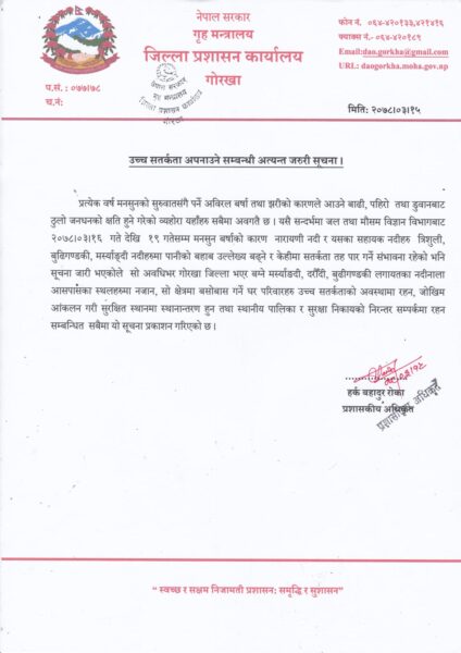 गाेरखा । जिल्ला प्रशासन कार्यालय गोरखाले सुचना जारी गर्दै उच्च सतर्कता अपनाउन अनुरोध गरेको छ ।