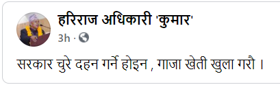 गाेरखा । गाेरखा निर्वाचन क्षेत्र नम्बर १ बाट निर्वाचित साँसद (विघटित प्रतिनिधिसभा) हरिराज अधिकारीले राज्यकाे व्यापार घाटा कम गर्न चुरे क्षेत्रकाे दाेहन राेकेर गाँजा खेती गर्न सरकारलाइ सुझाव दिएका छन् । सरकारले व्यापारघाटा कम गर्न भन्दै सँरक्षित चुरेक्षेत्र दाेहन गरेर भारतलाइ गिटि बालुवा बेच्ने निर्णय गरेकाे थियाे ।उनले टेलिफाेनमा भने कमजाेर भूगाेल रहेकाे चुरे सँरक्षण गर्नुपर्ने भए पनि सरकारले पर्यावरण बारे वेवास्ता गर्दै मुनाफाकाे उदेश्यलाइ पहिलाे प्राथमिकता दिदै आएकाे छ याे गलत हाे चुरे सँरक्षण गर्नुपर्छ नाफा गर्ने भए सरकारले गाँजा खेतीका लागि प्राेत्साहन गराेस, हिमाल झारलघाेरल पालेर त्यसकाे विक्रीबाट थप आम्दानी लिन सकाेस् । चुरे दाेहन गर्ने कुरा गलत छ ।