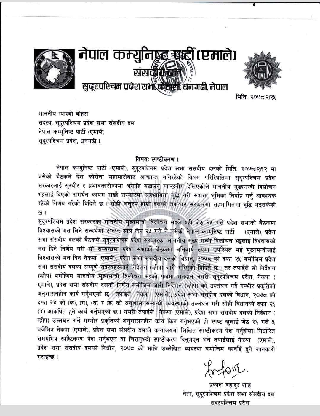 उनीहरूलाई भाेलिसम्म स्पष्टीकरण पेश गर्न निर्देशन दिइएकाे छ । स्पष्टीकरण चित्तबुझ्दाे नभए राजनीतिक दलसम्बन्धी ऐन तथा पार्टी विधानअनुसार कारवाही हुने पत्रमा उल्लेख छ ।