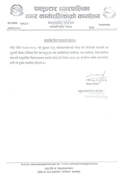 गाेरखा । तनहुँ जिल्लाकाे आँवुखैरेनी र गाेरखा जिल्लाकाे पालुङ्टार नगरपालिकाले शुक्रबार एकादशी पर्वकाे अवसरमा सार्वजनिक विदा घाेषणा गरेका छन् ।