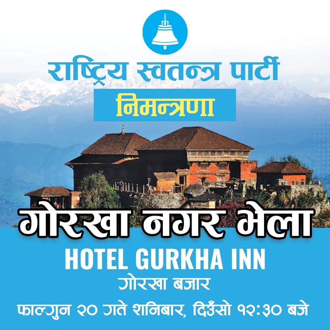 गाेरखा । राष्ट्रिय स्वतन्त्र पार्टि (रास्वपा) काे गाेरखा नगरपालिका स्तरीय भेला फागुन २० गते हुनेभएकाे छ । पार्टीका सहमहामन्त्री कविन्द्र बुर्लाकाेटिकाे प्रमुख आतिथ्यतामा हुने भेलामा गण्डकी प्रदेशका महामन्त्री अशाेक खड्का, प्रदेश सदस्य विशेष पन्त, जिल्लाका नेताहरु लगायतकाे सहभागिता रहने पार्टीले जनाएकाे छ ।
