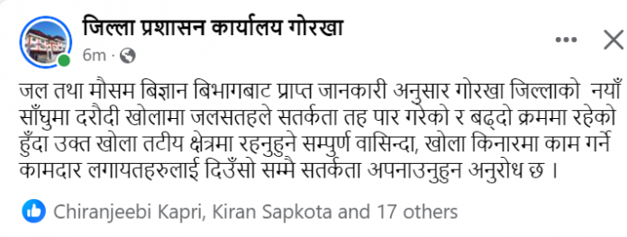 असार २७, काठमाडौं । जल तथा मौसम विज्ञान विभागको मौसम पूर्वानुमान महाशाखाले आगामी तीन दिन भारीदेखि अति भारीसम्म वर्षा हुने चेतावनी जारी गर्दै उच्च सतर्कता अपनाउन अनुरोध गरेको छ । विभागका अनुसार गाेरखा जिल्ला उच्च जाेखिमकाे क्षेत्रमा परेकाे छ । जिल्लाकाे गाँखु स्थित जलमापन केन्द्रमा दराैँदी नदिकाे पानीकाे सतह उच्च रहेकाे छ । तल्ला तटिय क्षेत्रका नागरिकहरुलाई सतर्कता अपनाउन आग्रह गरिएकाे छ ।