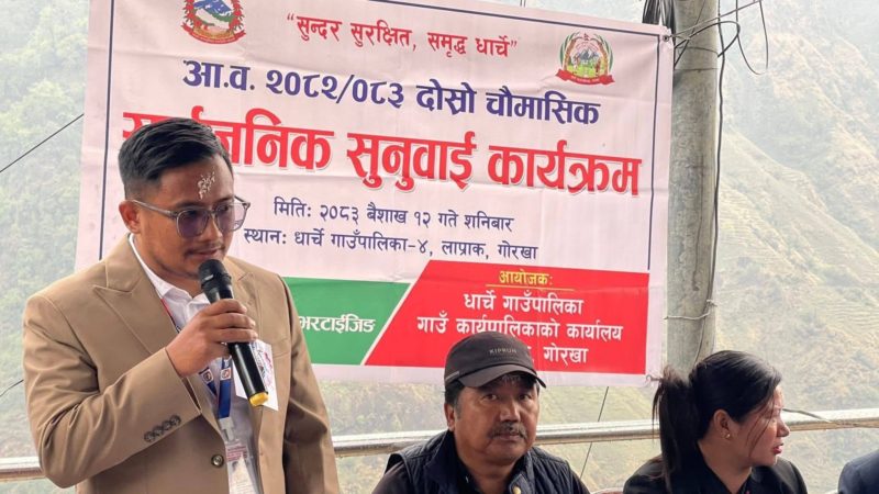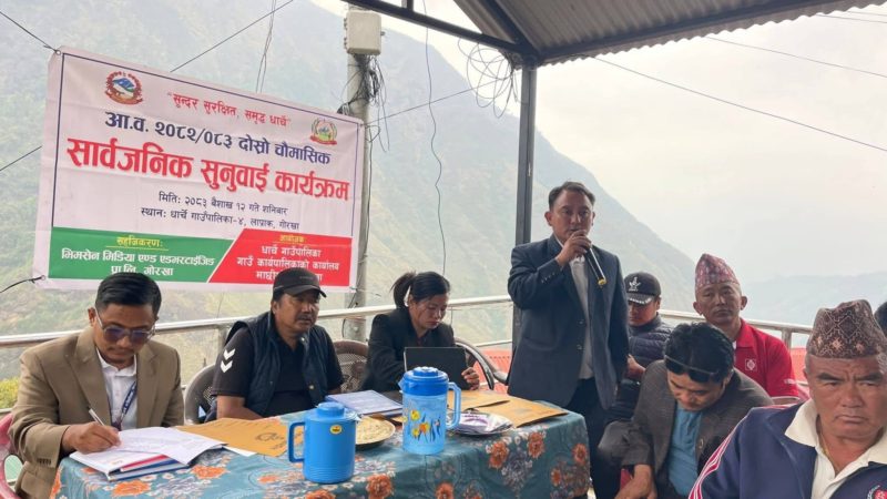 १३ वैशाख, गोरखा । धार्चे गाउँपालिका गोरखाको दोस्रो चौमासिक सार्वजनिक सुनुवाई कार्यक्रम सम्पन्न भएको छ । शनिबार धार्चे गाउँपालिका वडा नम्बर ४ लाप्राक स्थित मनिकाङ डाँडामा कार्यक्रम भएको थियो ।